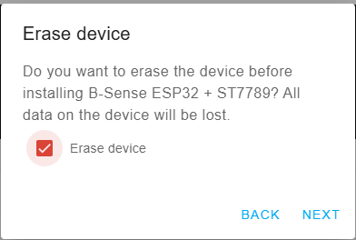 - Erase device: recommended for first install. For later updates, keep erase off to preserve Wi-Fi, timezone, and future API settings.