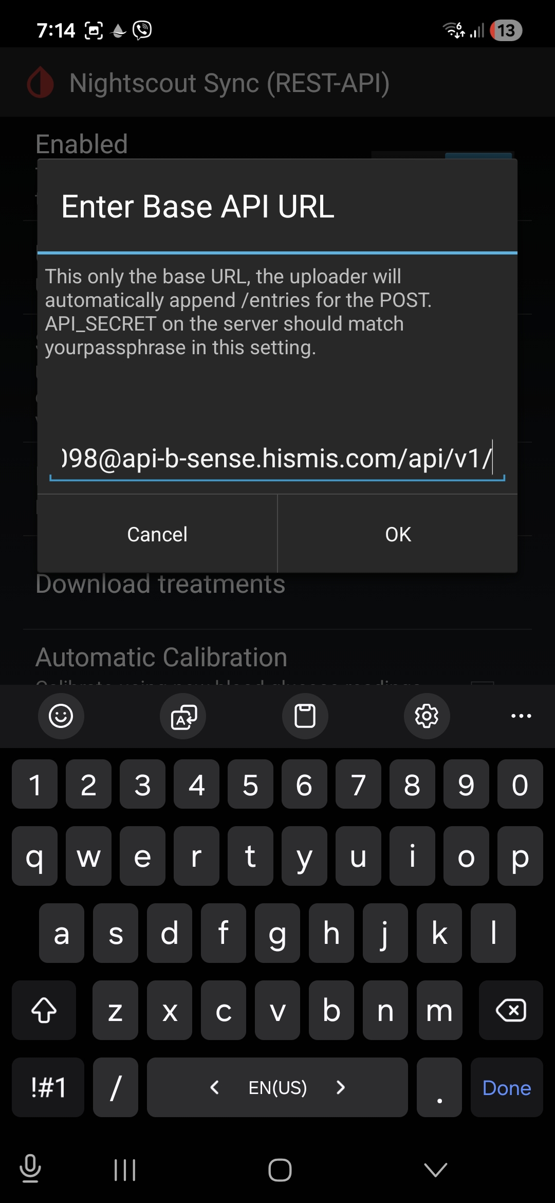https://YOUR_BSENSE_API_KEY@api-b-sense.hismis.com/api/v1/. - For self-hosted Nightscout: enter your Nightscout URL and use your Nightscout